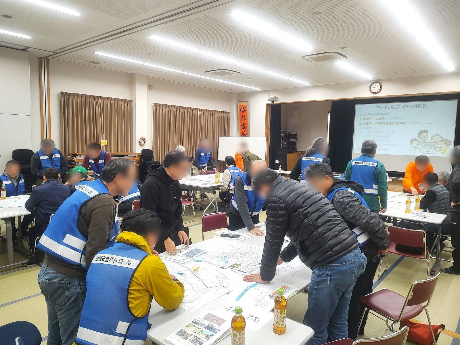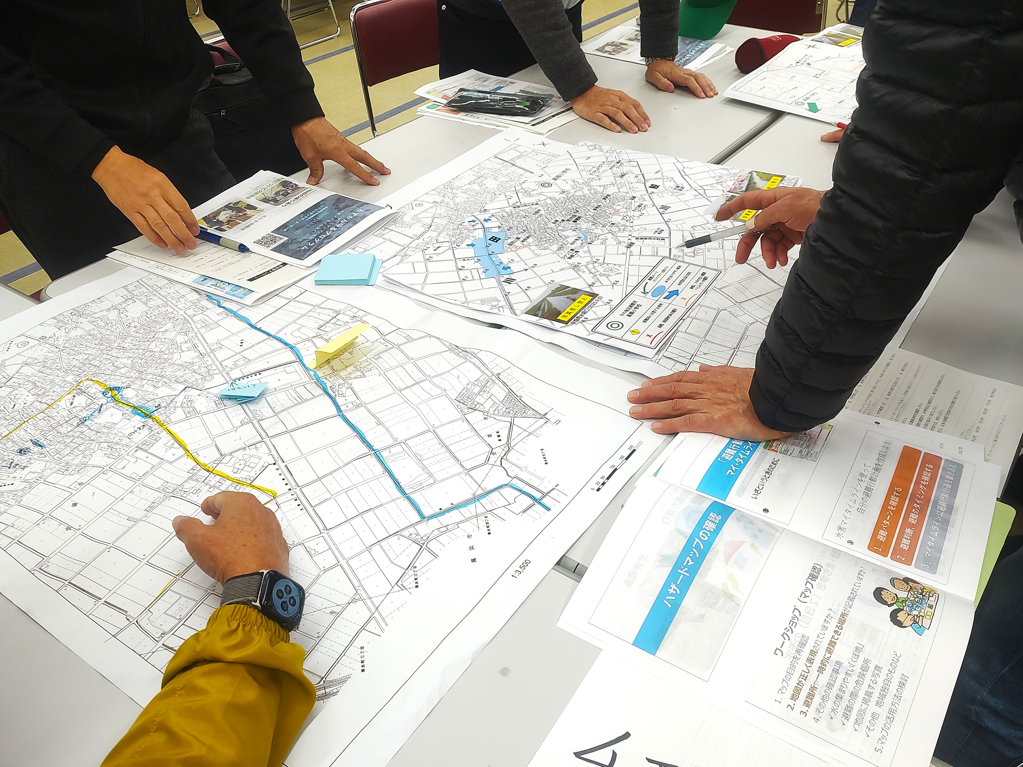 自主防災組織のメンバーが4つの班に分かれて、現地確認や危険個所のマッピング、避難経路の確認を行い、計2回の会議をもって、ハザードマップの作成を終えました。手づくりハザードマップで地域の水害特性を理解し、実際の水害で正しい判断・行動につなげて行きます。