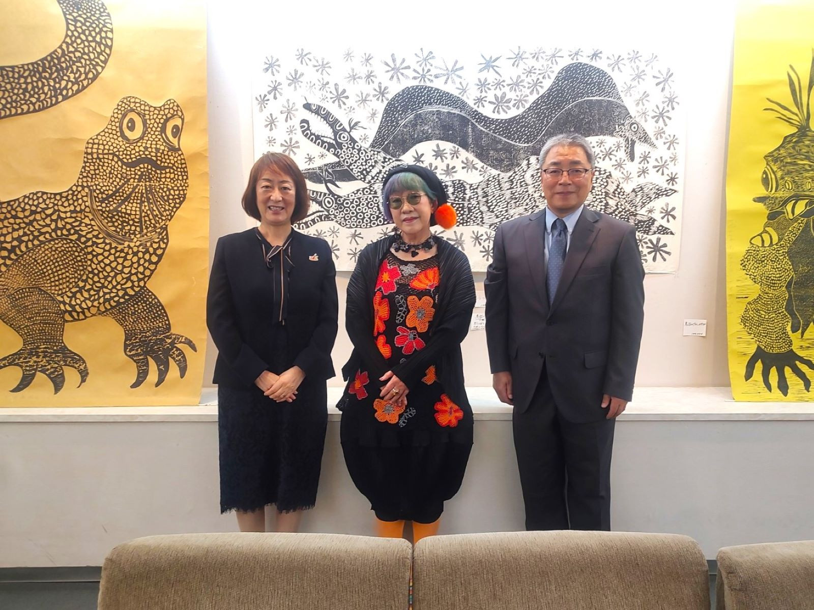 先生がモチーフとしているは生き物で、水族館ということもあり海のお魚たちの作品が所狭しと展示されていて、私も生き物好きなのでしばらく見入っていました。すると偶然ですが、画廊に訪れたのは山口智絵子大府市副市長。以前にも愛知県美術館ギャラリーで岡村秀人大府市長とお会いさせていただきました。また、私より先に画廊へお越しの方々の中に安城市在住の方がお見えになったりと、成田先生の作品展では新しい出会いがあって、わくわく感があります。