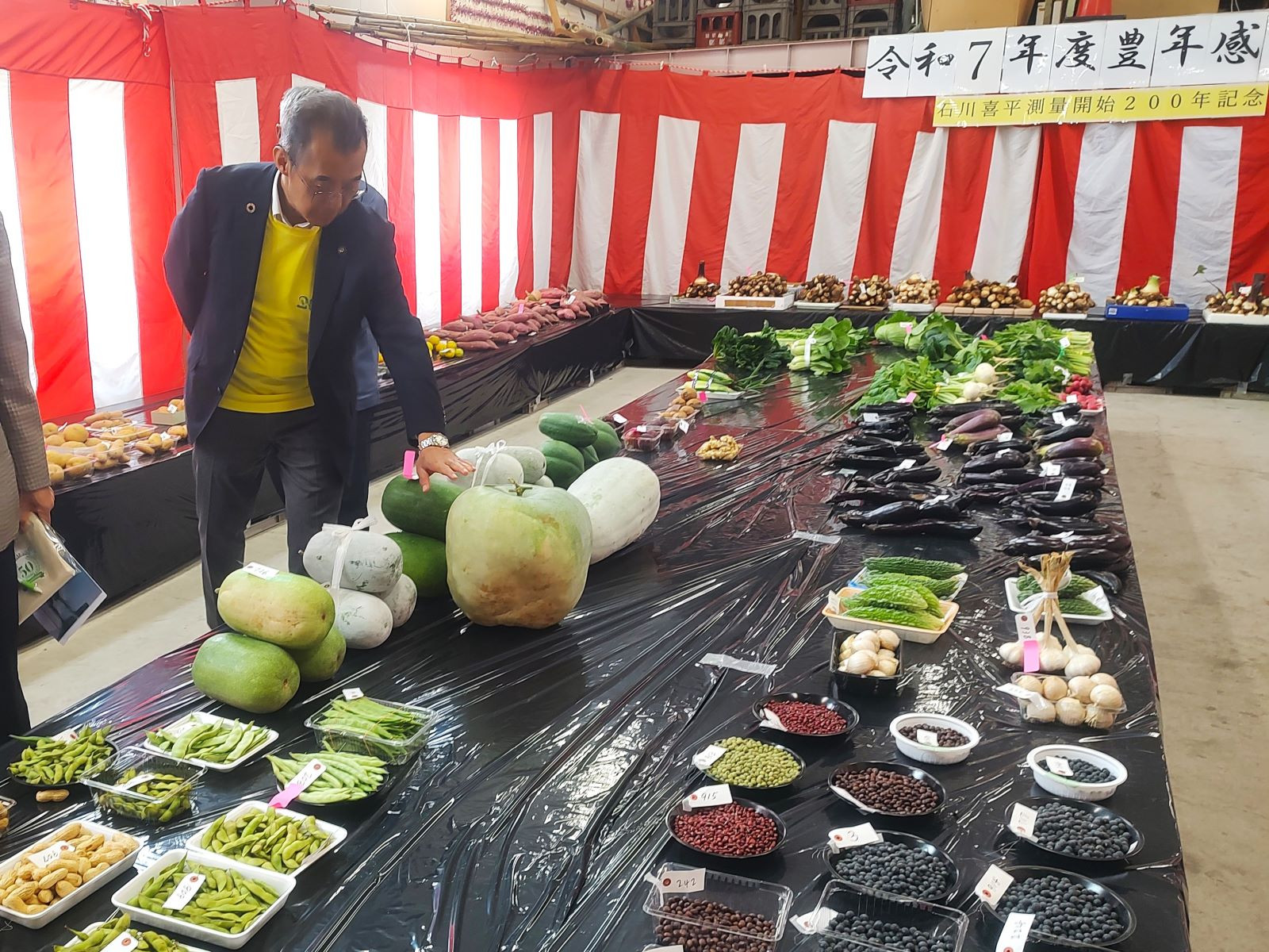 午前中、三星元人市長が来訪され、力作ぞろいの作品展や、精一杯手をかけて育てた野菜の品評会などをご覧になっていただけました。野菜の出品数は昨年も少なかったのですが、今回も猛暑の影響で、ダイコンやニンジンといった根菜類がほとんどない状態で少し寂しいです。