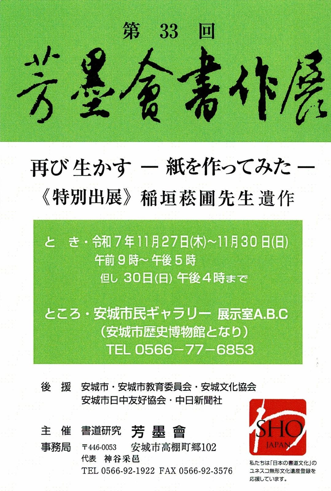 11月27日(木)から30日(日)まで、安城市民ギャラリーにおいて、私の所属する書道グループ芳墨會(ほうぼくかい)の書作展が開催されます。私は3年連続で出展させていただくことになりました。