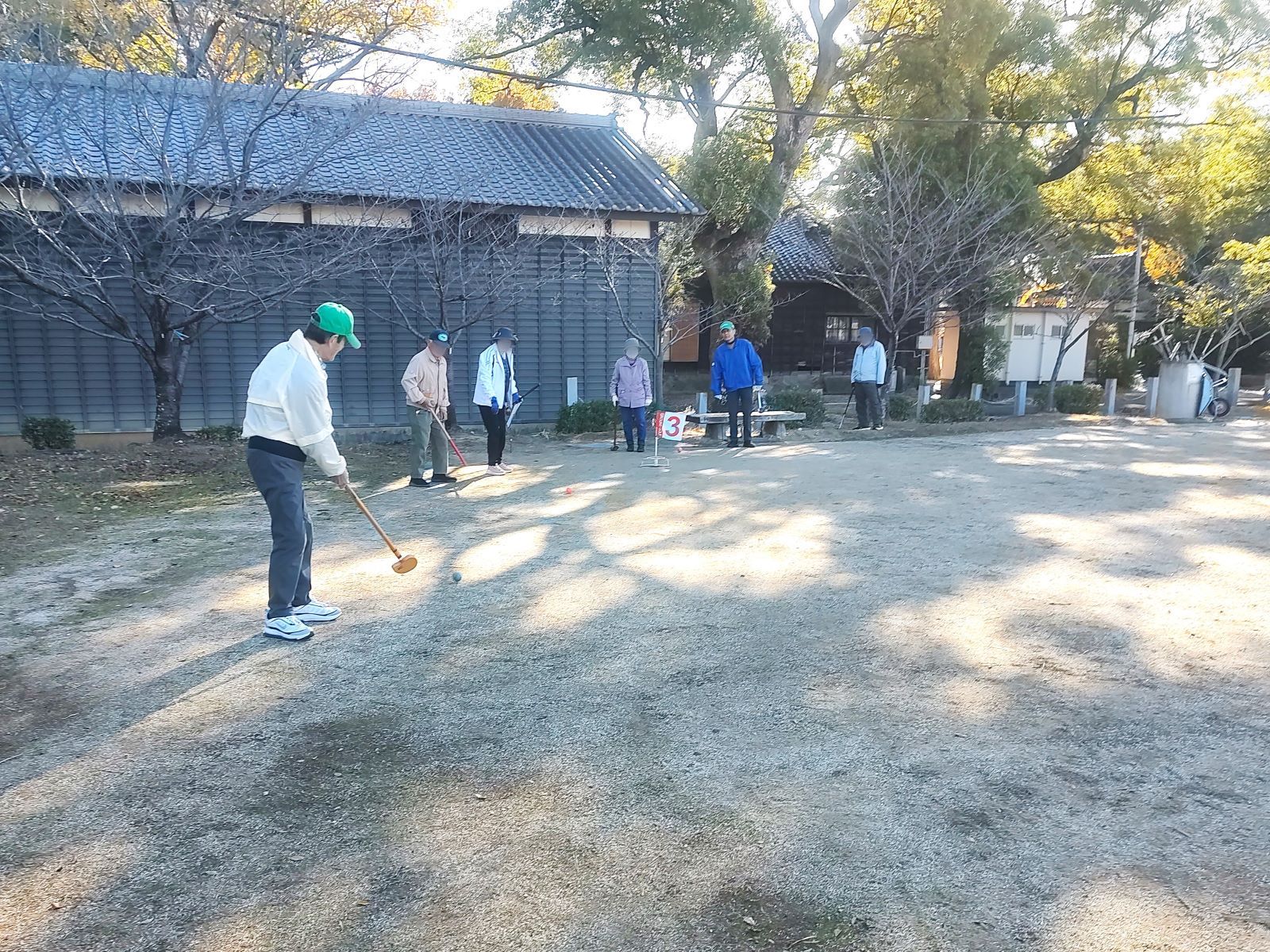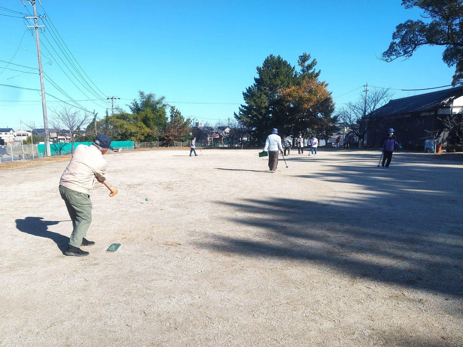 22日午前8時30分より、高棚神明神社に隣接する宮西公園において、地元老人クラブさんのグラウンドゴルフ大会が開催されました。素晴らしい秋晴れの空のもとで、23名の会員さんが5チームに分かれて、ワイワイガヤガヤにぎやかに優勝とホールインワン賞を目指しました。