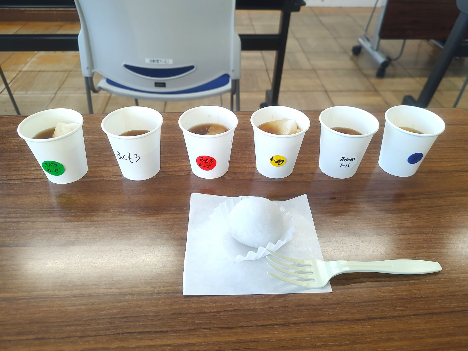 この試食会は、「お餅が食べたいけれど、食べるのが危なさそうなご家族のいらっしゃる方向けの介護食」向けのものですが、私は高齢者や小さなお子さま向けの防災食として興味がありましたので参加しました。お雑煮仕立ての6種類と、デザート1つの計7種類を試食しました。