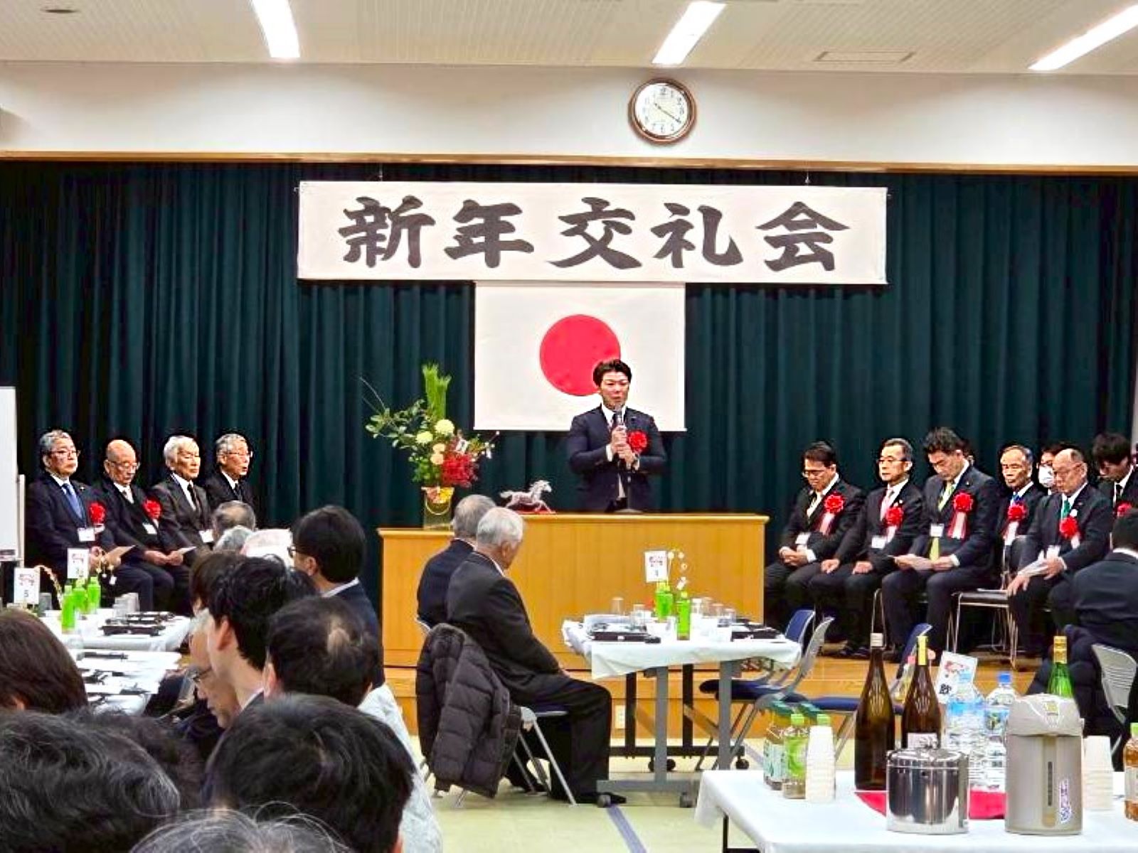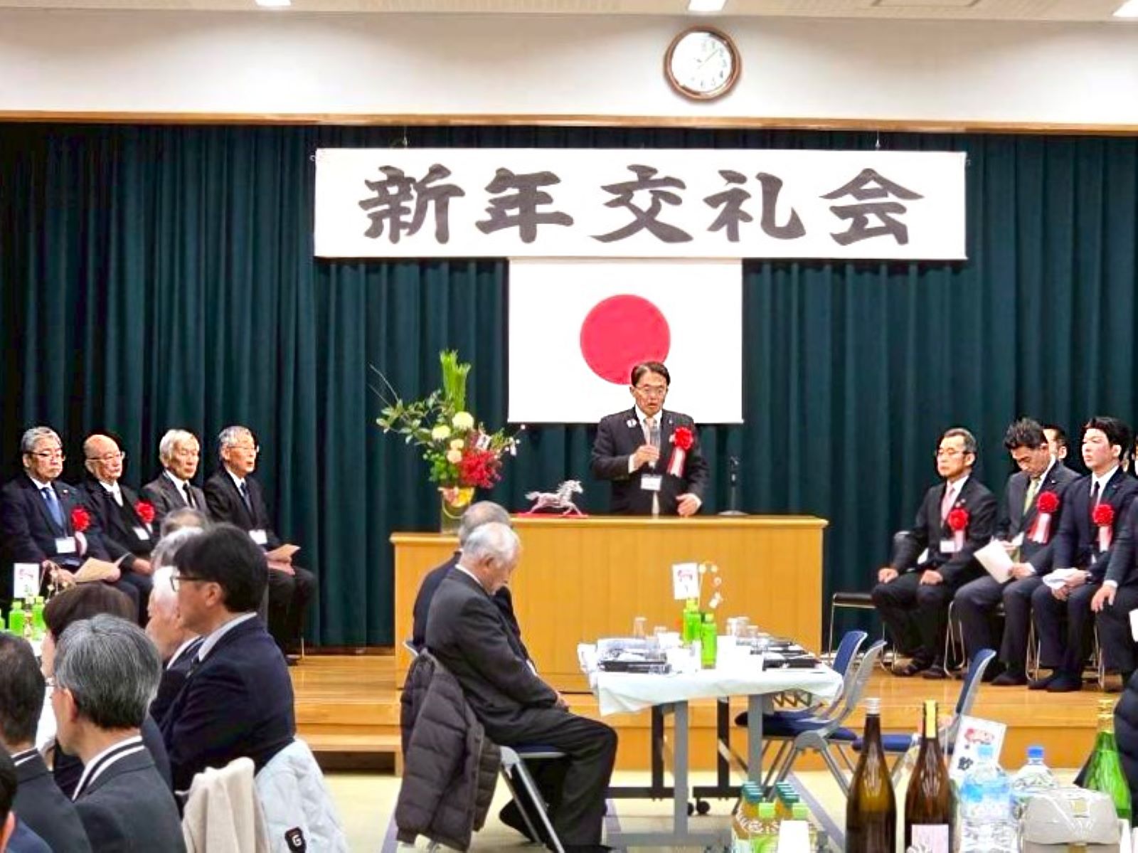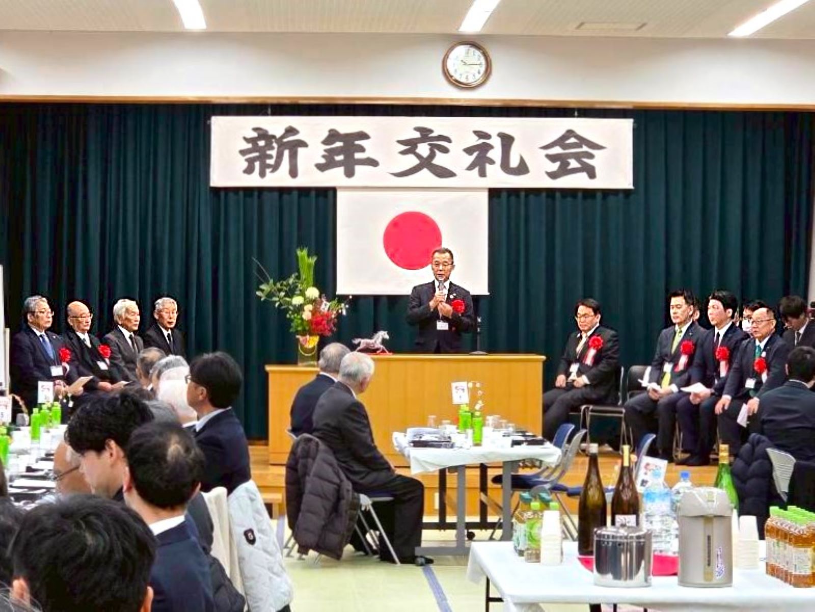 大村秀章知事、三星元人市長、今井隆喜県議をはじめ、来賓の皆さまや町内でご活躍の皆さま、地元企業の皆さまにもお越しいただき、100名ほどの盛大な新年交礼会となりました。誠にありがとうございます。