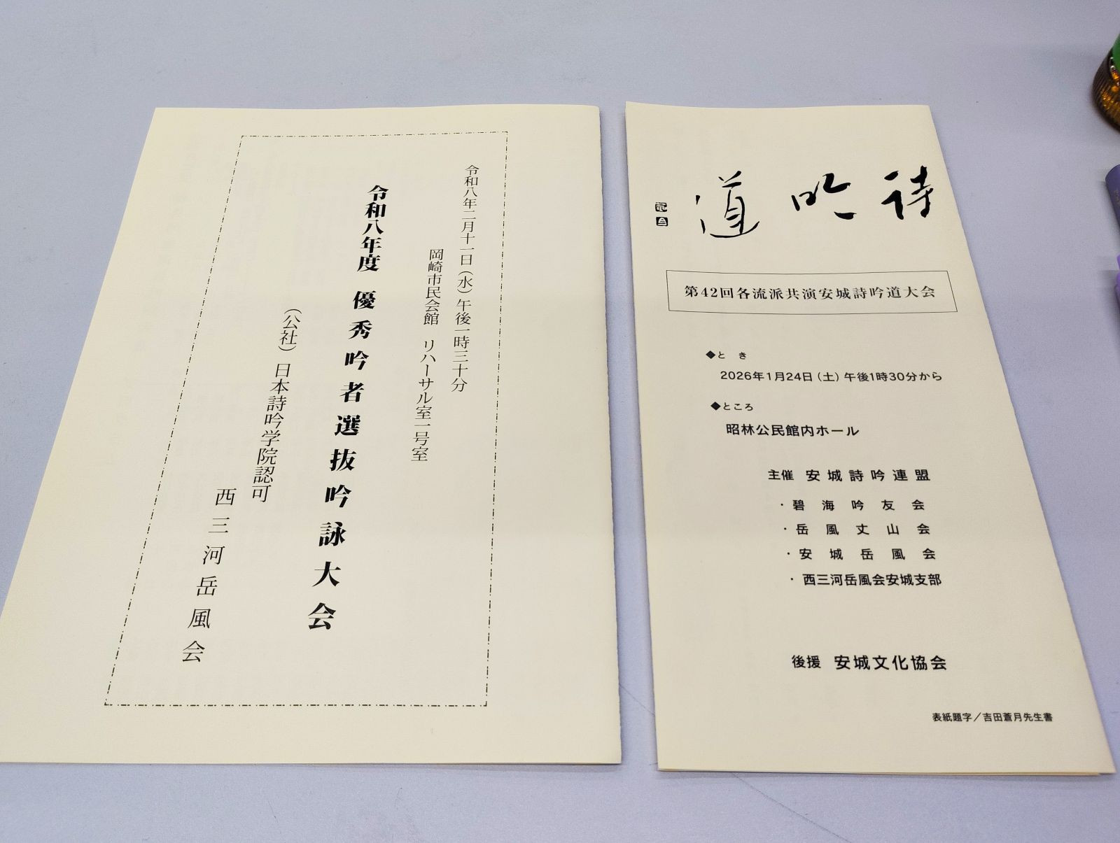 16日午後、市職員との打ち合わせを終えてから、急いで詩吟教室の稽古へ。今月1月4日の西三河岳風会『初吟会』に続き、24日には市内4団体による『各流派共演 安城詩吟道大会』が、2月11日には西三河岳風会の『優秀吟者選抜吟詠大会』が連続して開催されます。