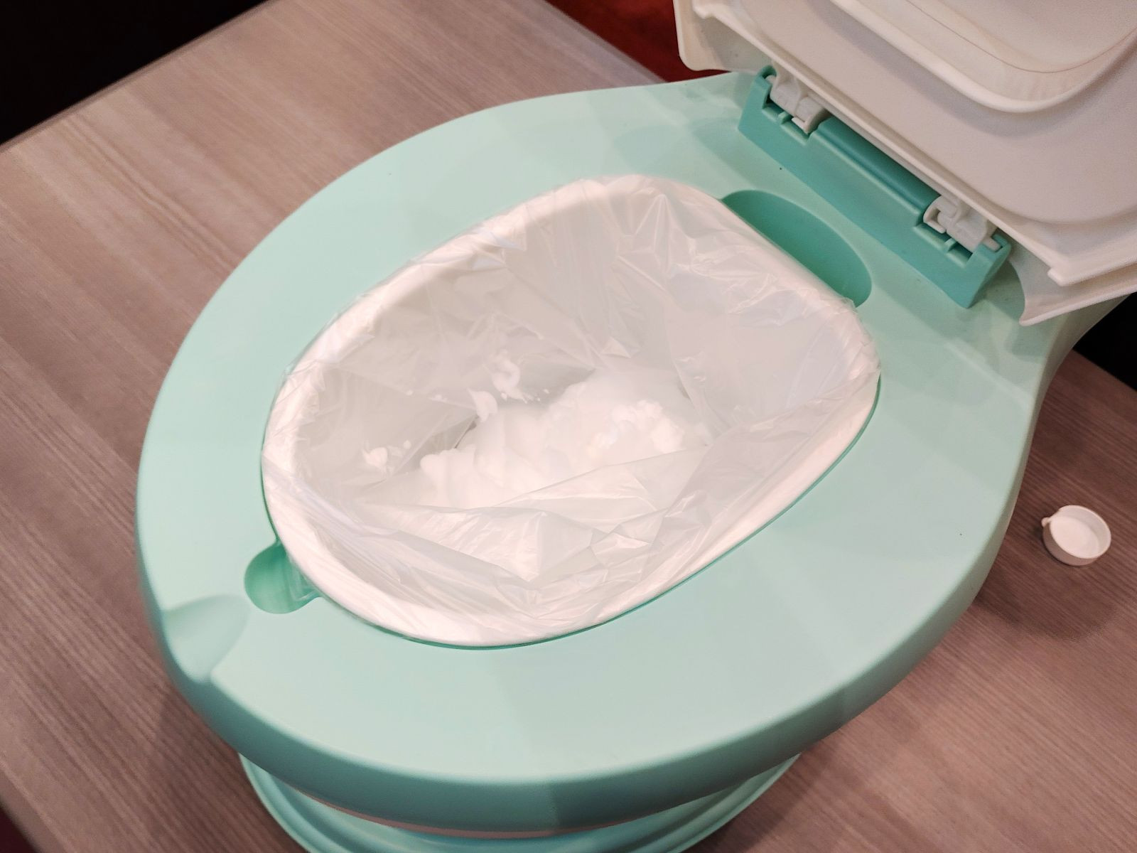 私は防災ボランティアの活動で、断水時のトイレ使用方法を実演させていただいていますが、排尿や排便のたびに凝固剤と45Lサイズのビニール袋を使用するのは、膨大なごみを生み出します。このシューポンであれば、排尿・排便ごとに泡でフタをしながら複数回重ねて、最後に凝固剤を入れて固めることができ、ごみの量の削減が可能です。