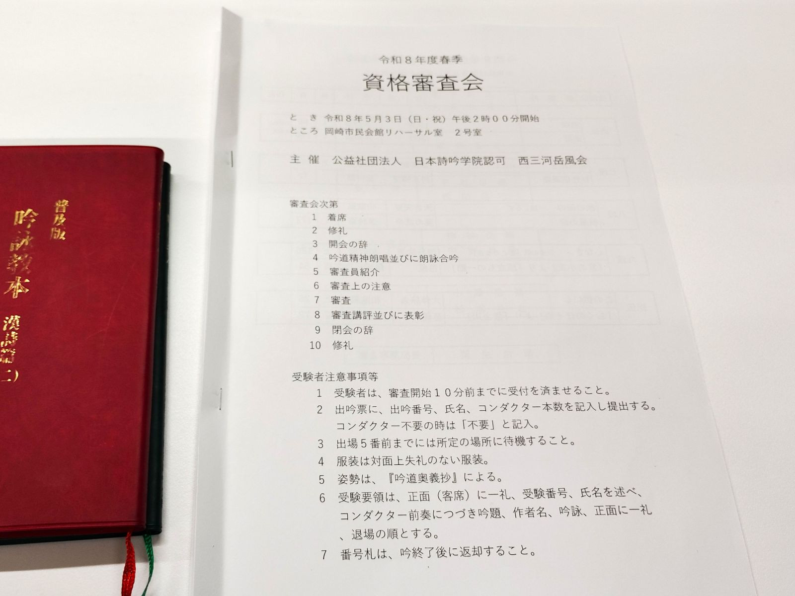 20日午後、月3回開催の詩吟教室の稽古へ。3月議会中であったことから、今月は初めての出席となりました。花粉症で少し鼻声ながら、5月3日に開催される、西三河岳風会の『令和8年度春季資格審査会』へのエントリーが決まっており、今から調整しておく必要があります。