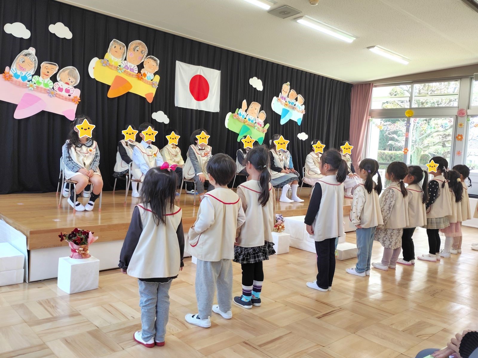佐藤園長先生から卒園証書が卒園児1人1人に手渡され、さらに園長先生からはお祝いの言葉として、卒園児1人1人に園での出来事や思い出を語りかけ、とても感動的な場面でした。在園児がお別れの歌を送り、卒園児が2曲を合唱ののち、担任の先生が卒園児に花を手渡して送り出しました。