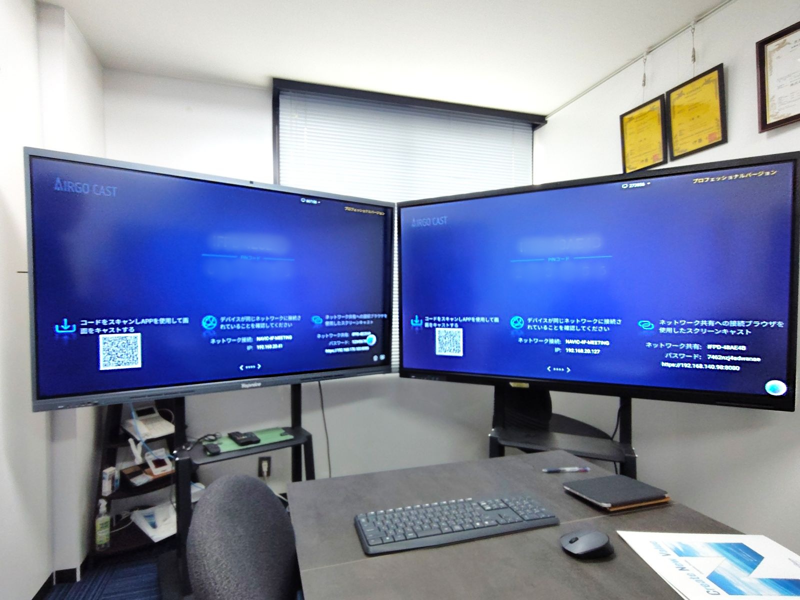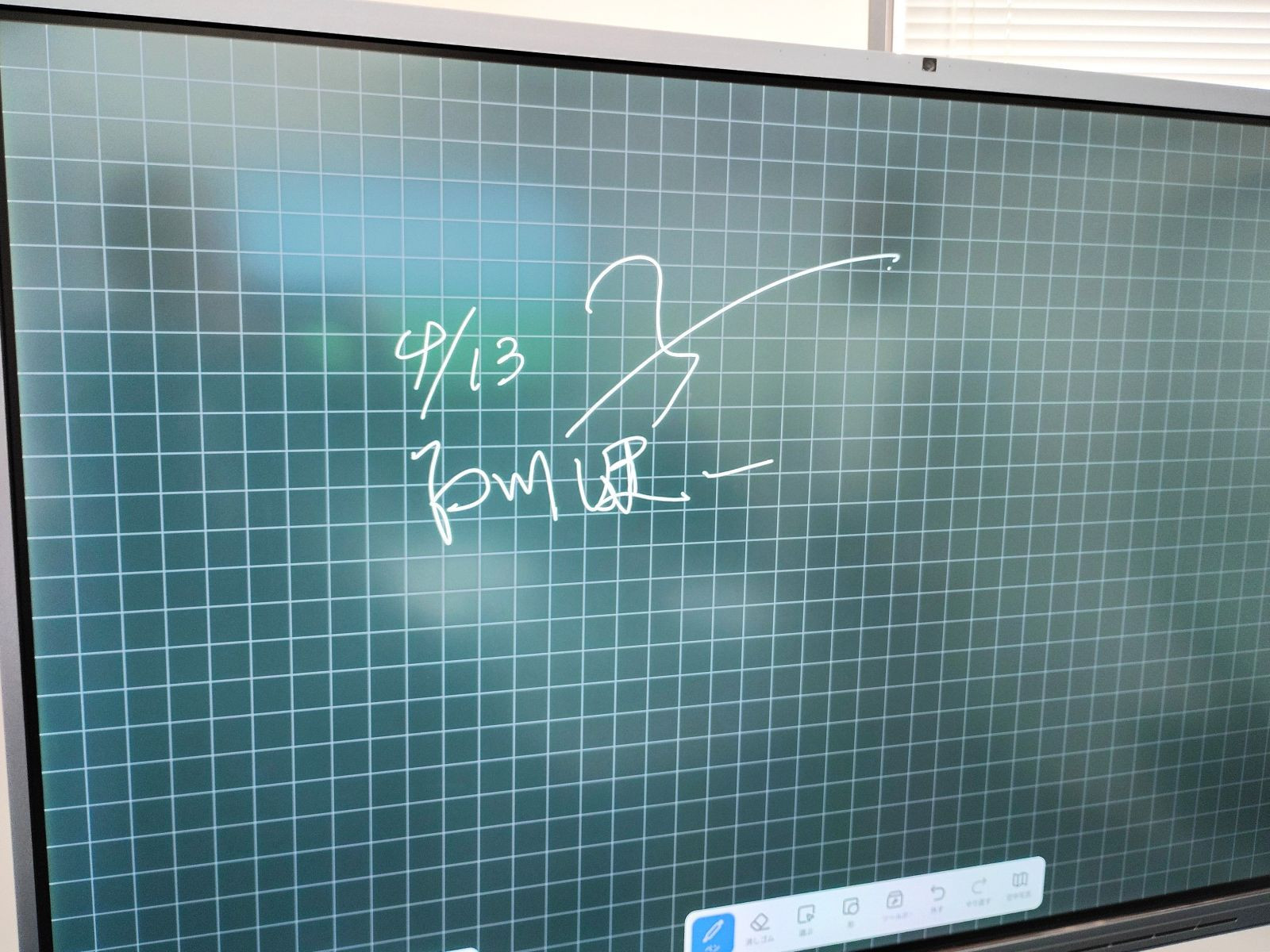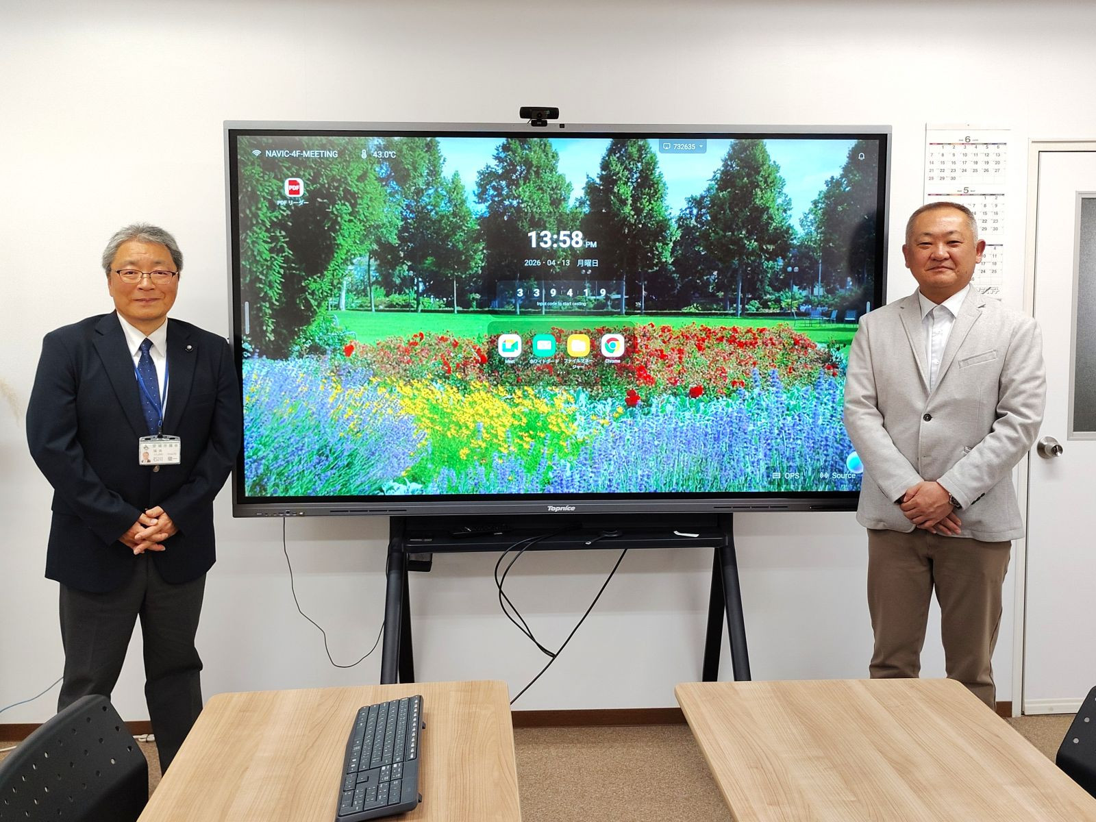 電子ホワイトボードといっても、wifi接続により複数のボードを連携させたり、オプションでPCを搭載すれば、活用の用途はさらに広がります。サイズは65インチと85インチがあり、杉浦社長と一緒に撮影させていただいた85インチは、通常のホワイトボードサイズの大きさです。