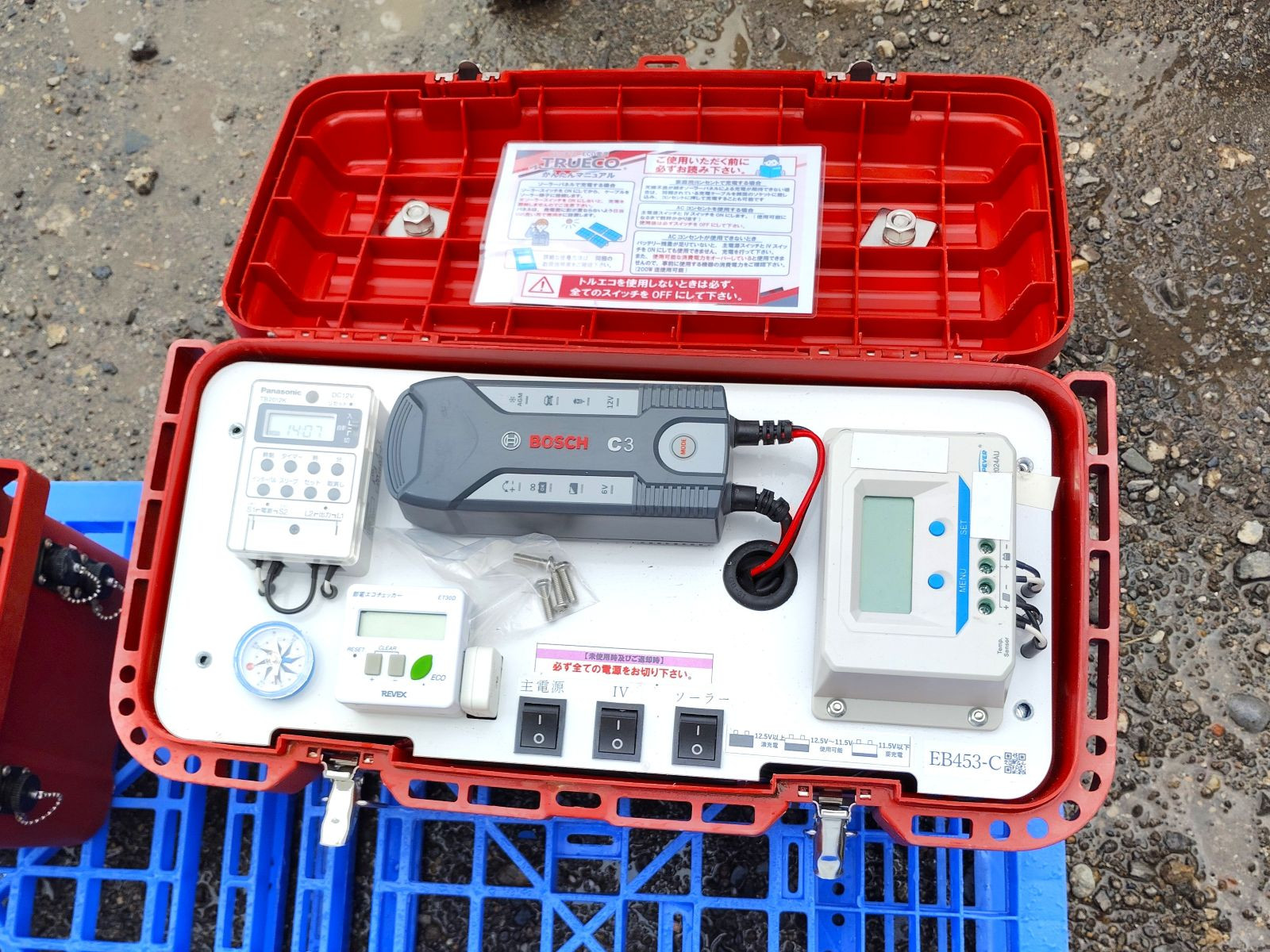 屋外では、ツールボックスの洗浄作業が行われており、その中身は何とポータブル電源でした。電源のない工事現場等で活用可能な、ソーラーパネルとのセットになった電源となっており、そのリース事業が好調とのこと。かつて公共工事に携わっていた私は、こちらの電源も気になりました。