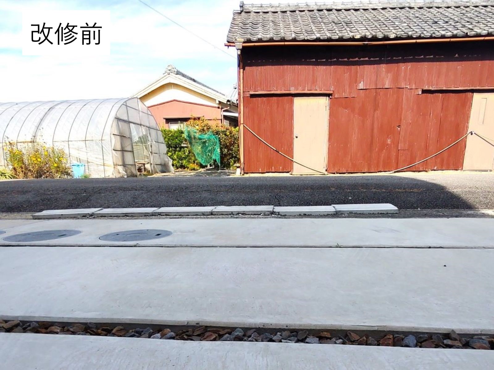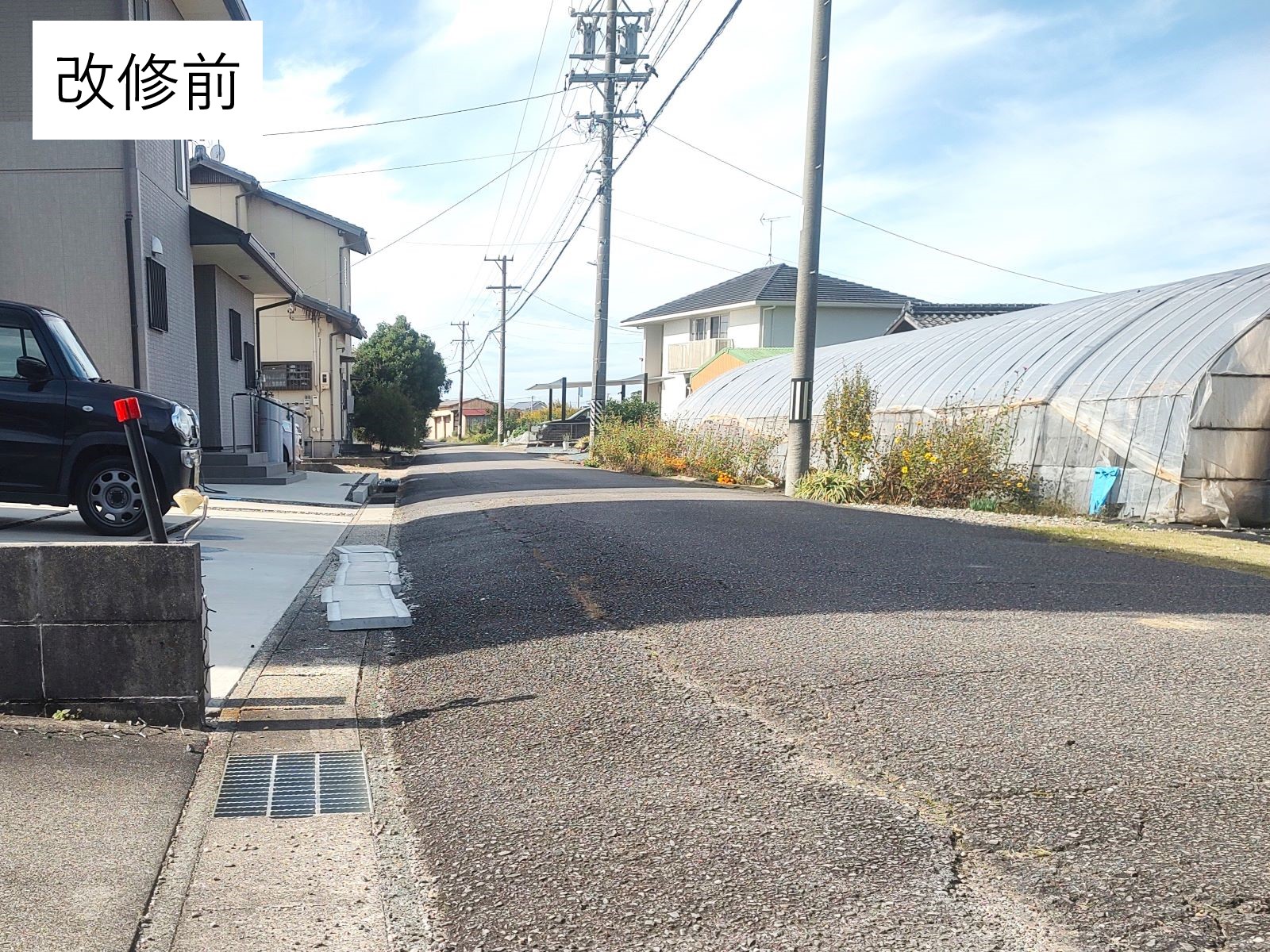 市道の路面排水の勾配を残しつつ、市道と側溝との高低差が解消されました。側溝上に重ねていた甲蓋も取り除かれて、スムーズな車両の出入りができます。
