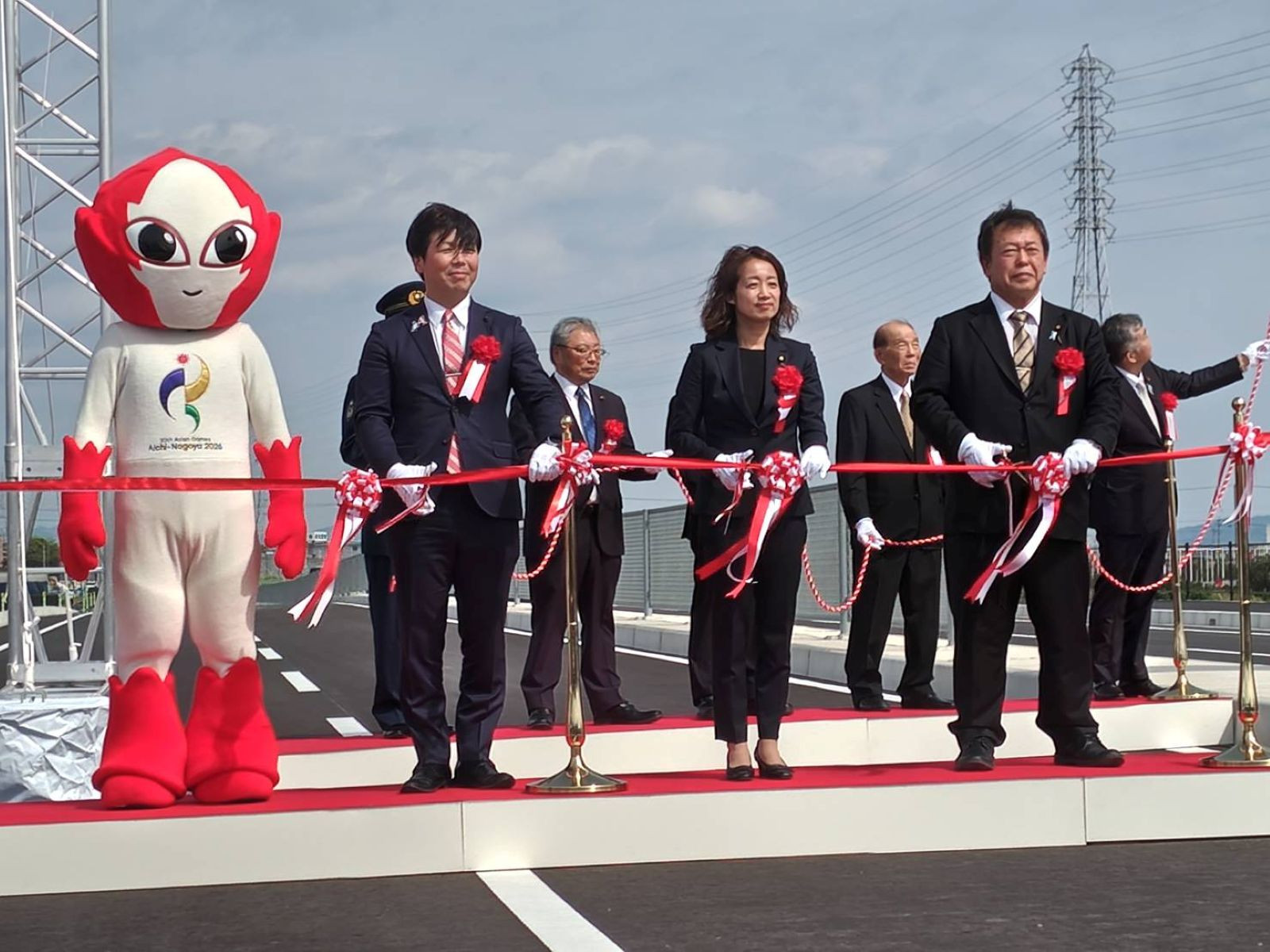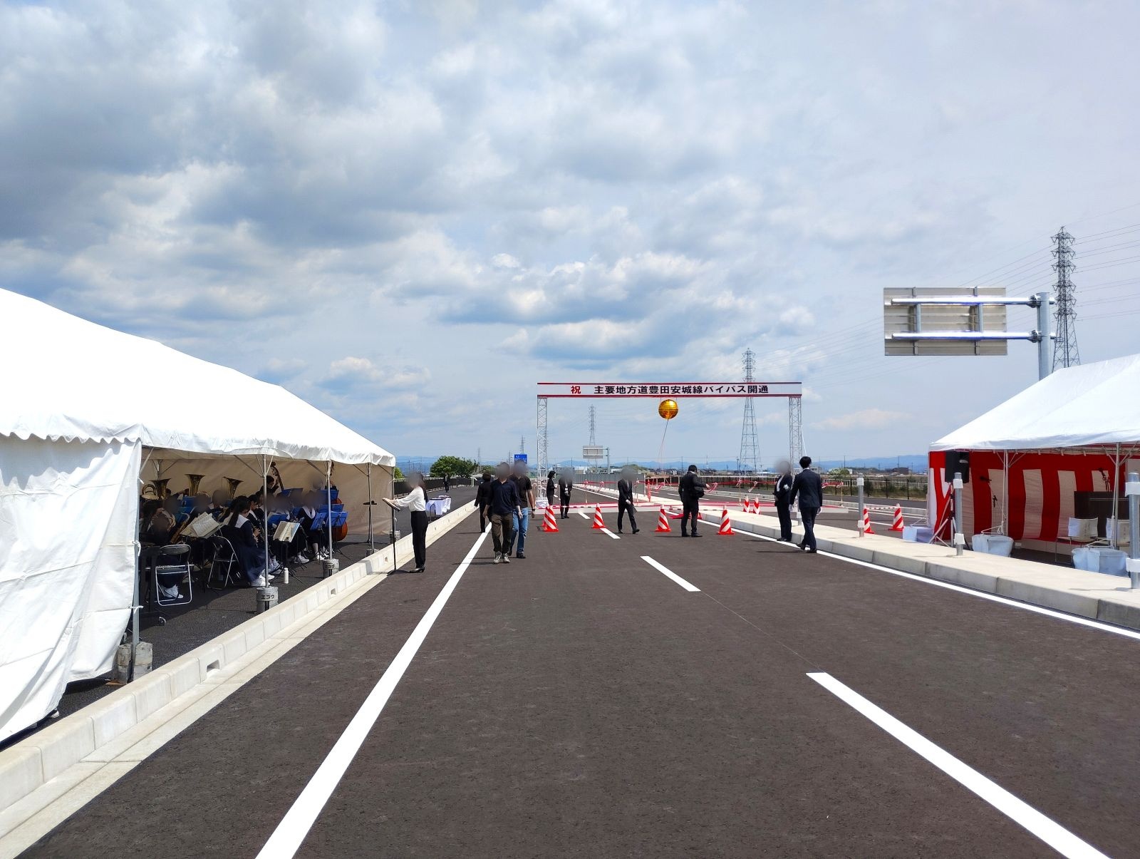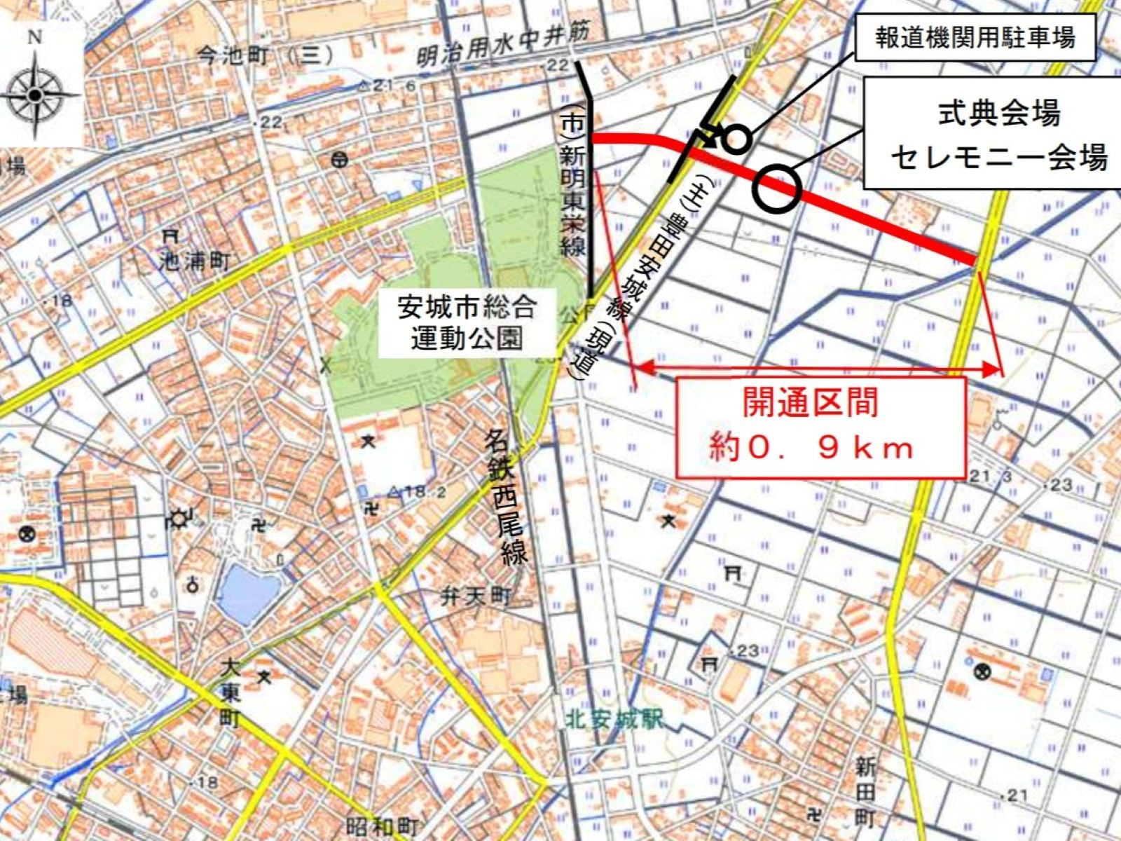 豊田安城線は、豊田ICから安城を通り、衣浦港、中部国際空港(セントレア)をつなぐ主要地方道です。安城を含む西三河地域は、東西方向に比べ、南北方向の道路が弱いため、整備が急務となっています。一方でこの豊田安城線は、安城市内の一部区間1.2kmを残して未整備区間が存在し、迂回と渋滞が発生して不便な状況が続いていました。この1.2kmのうち、今回の900m区間が完成して開通となりました。すぐ近くには、2026年アジア大会のソフトボールと近代五種競技の会場となる、安城市総合運動公園があります。