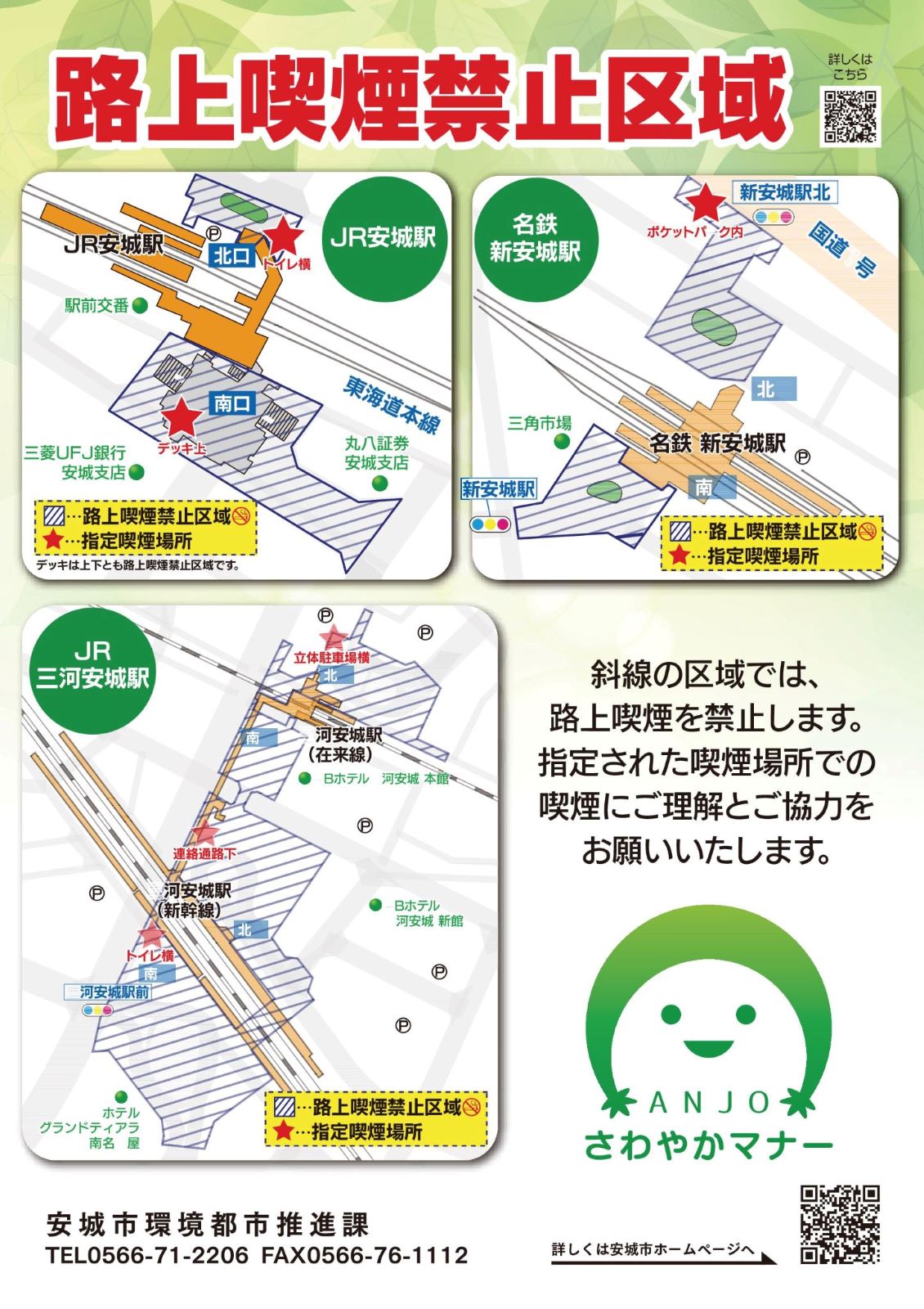 安城市では、『安城市さわやかマナーまちづくり条例』として、6つの「さわやかマナー」を定め、JR安城駅、JR三河安城駅、名鉄新安城駅において、平成27年4月1日より施行されています。この条例の特色は、まちづくりの手段として罰則は採らずに、皆さまのモラル向上とマナー遵守を通して、きれいで快適なまちを目指しています。