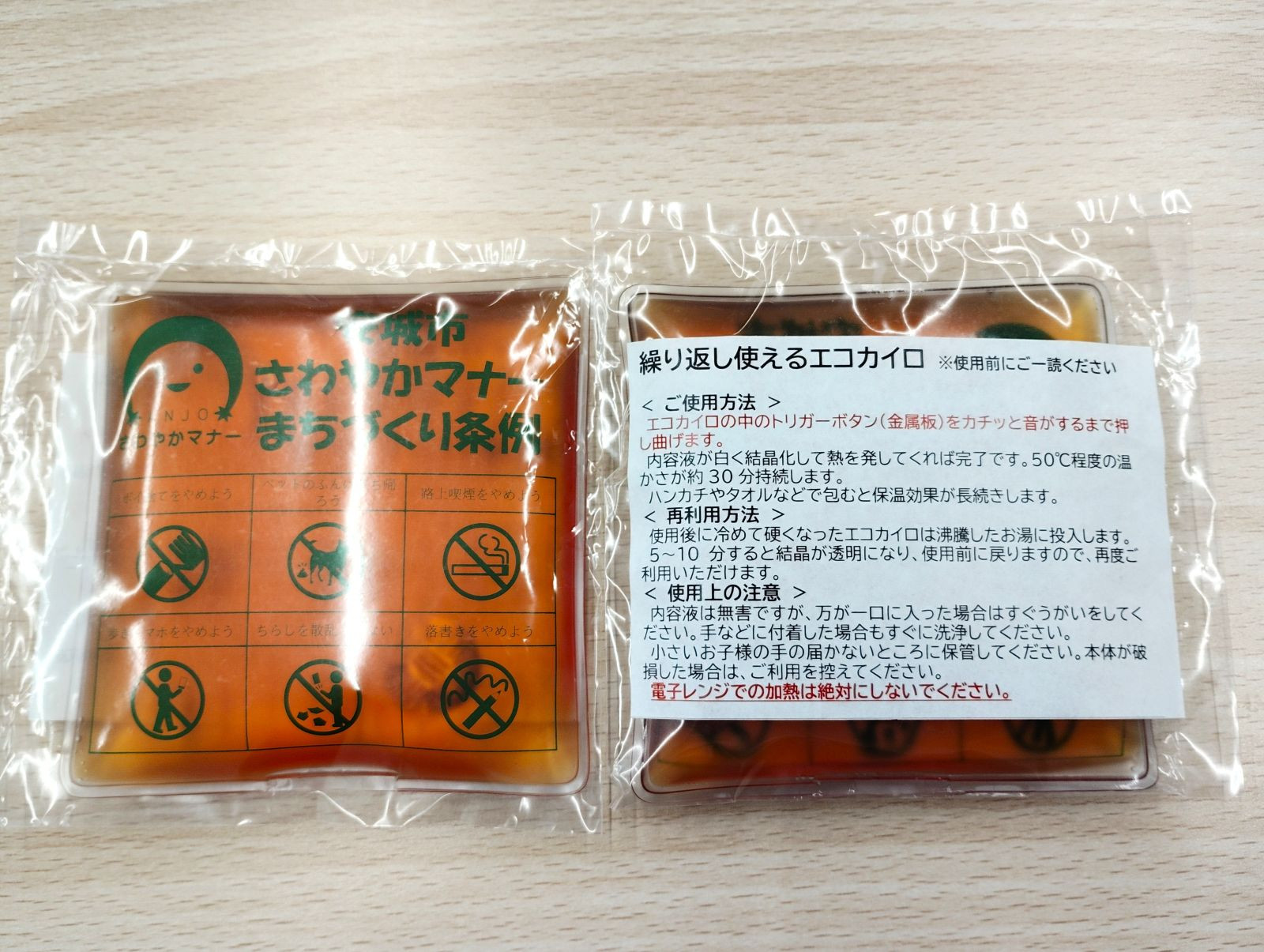 新たな啓発品として「リサイクルカイロ」も配布されており、啓発品の工夫もされています。多くの駅利用者に条例を認知していただけるようにしたいものです。